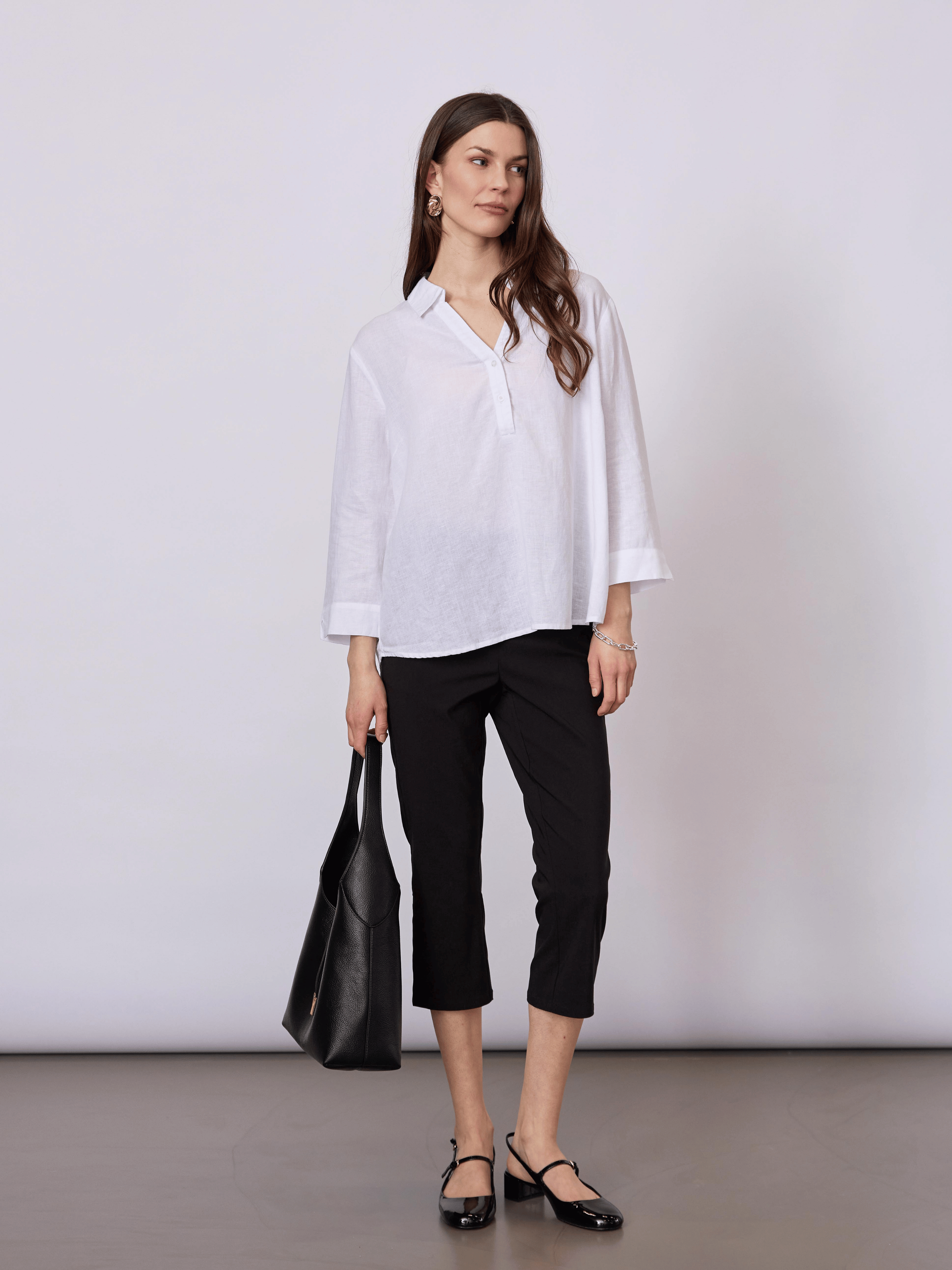 Let og luftig skjorte i en hør- og viskoseblanding med et rent, tidløst udtryk. Den afslappede pasform og den enkle stolpelukning gør den velegnet til både hverdag og varme dage.