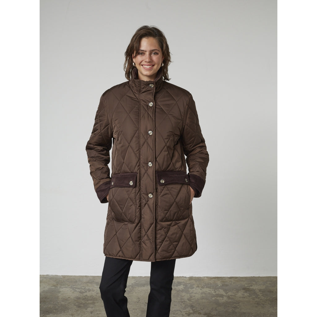 Bliv stilfuld med denne quiltede jakke, der har elegante fløjlsdetaljer ved lommer, ærmer og krave. De diskrete slidser med knaplukning i siderne giver ekstra komfort og bevægelsesfrihed.