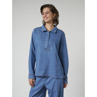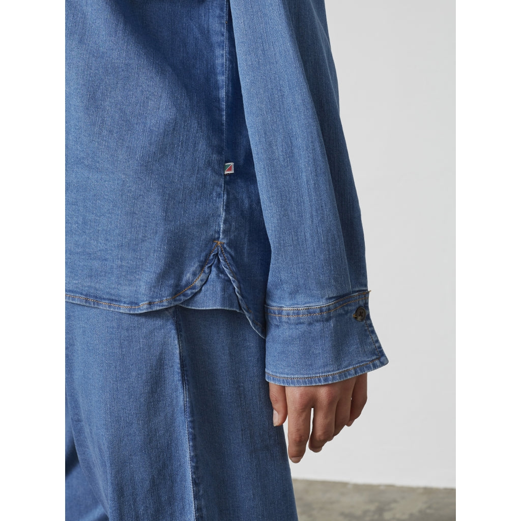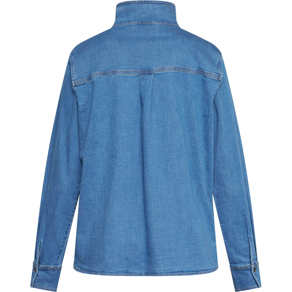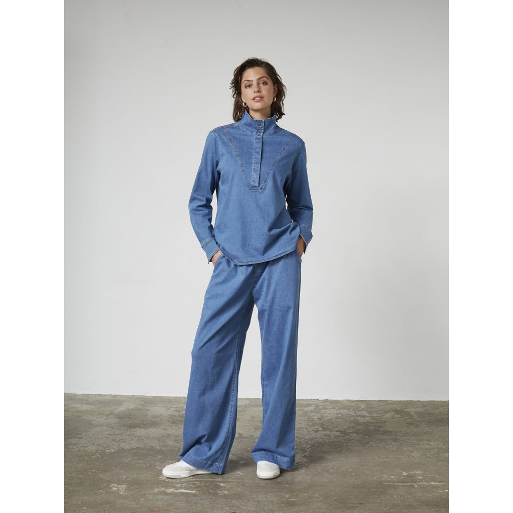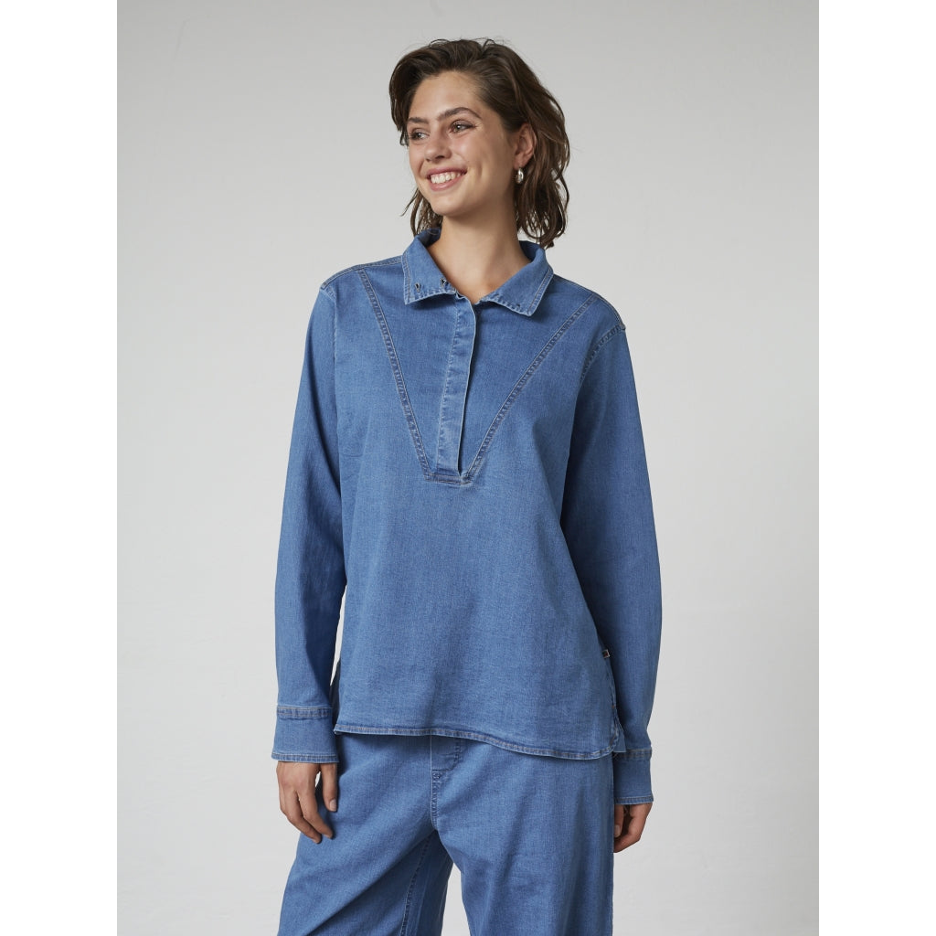 Langærmet bluse i blød, let kvalitet med denim-look. Krave og stolpelukning giver et klassisk udtryk, mens den afslappede pasform gør den behagelig hele dagen. En alsidig model, der fungerer både alene og som del af et sæt.