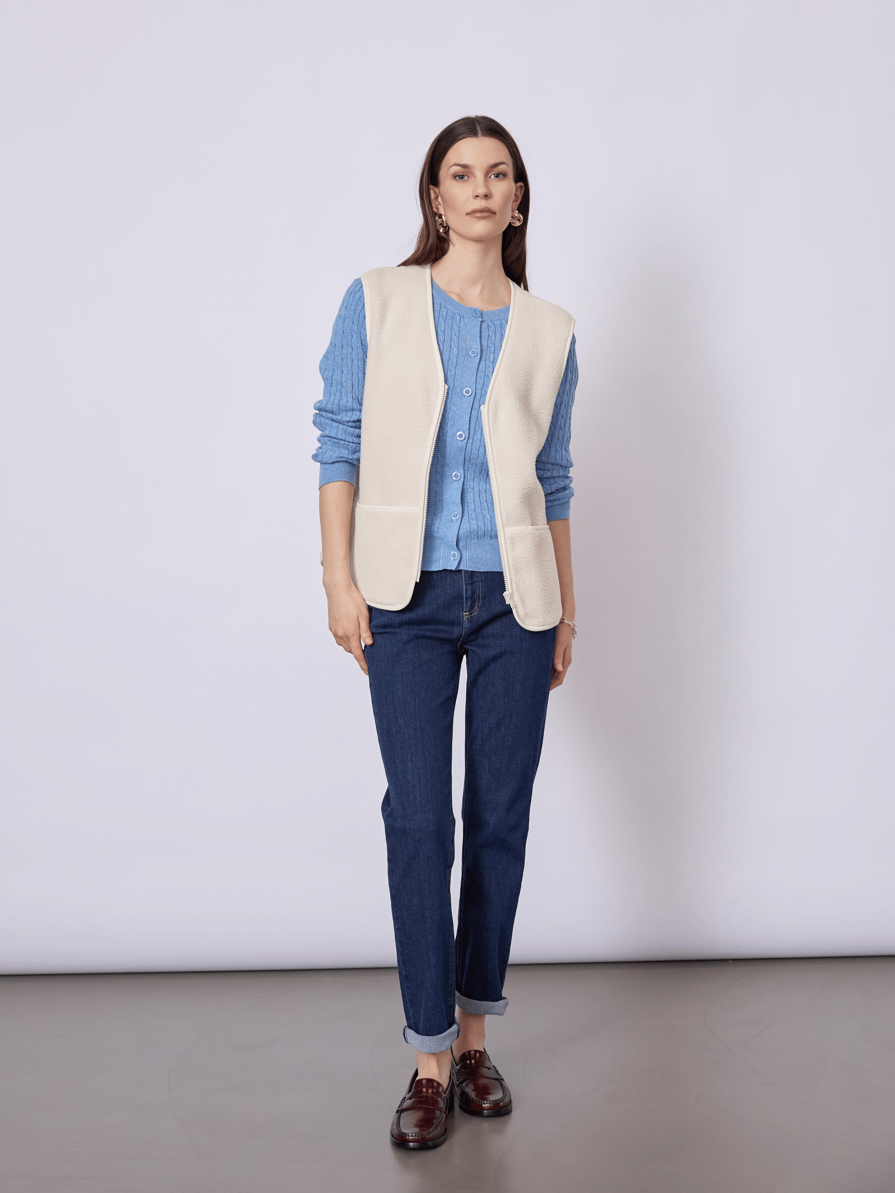 Blød og let vest i 100% polyester med et enkelt og funktionelt udtryk. En alsidig vest, der er ideel som ekstra lag over strik eller skjorte i overgangsperioder.