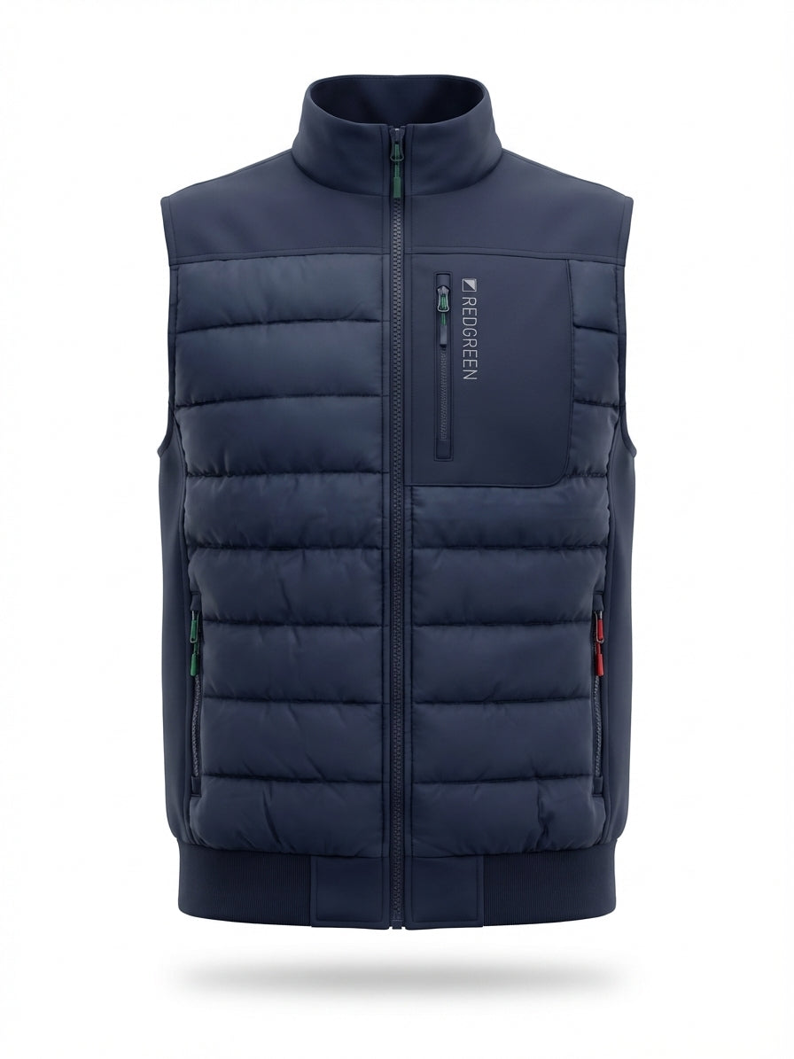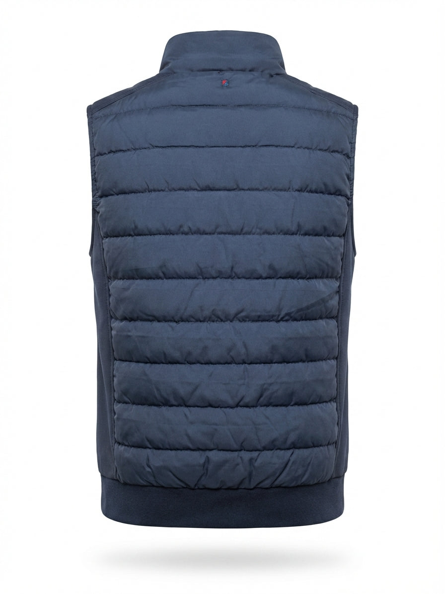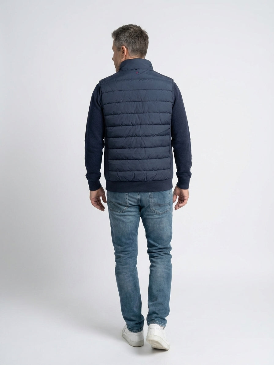 Let og funktionel quiltet vest i 100% polyester med ståkrave og lynlåslukning. Et praktisk mellemlag til skiftende vejr med et enkelt, maritimt udtryk.