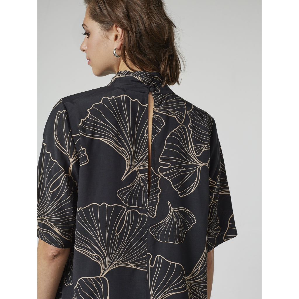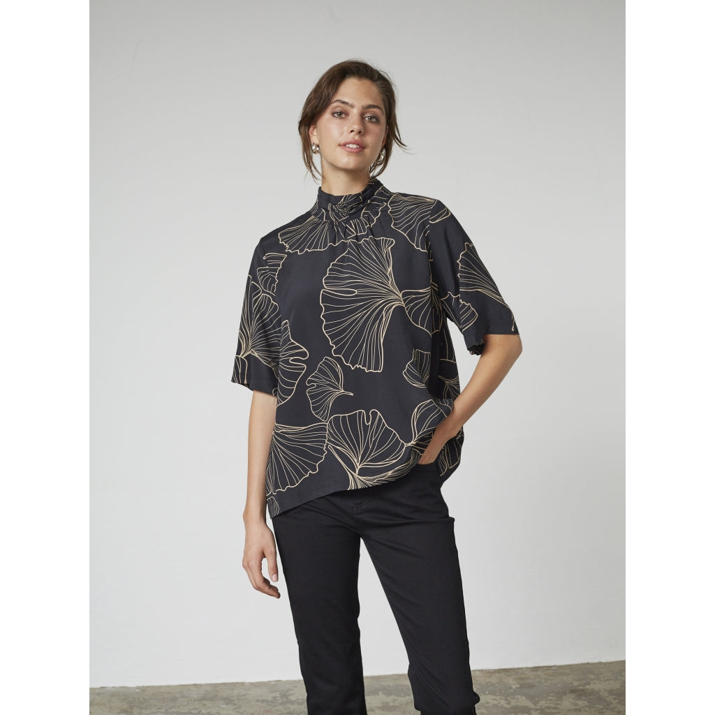 Die Amaya-Bluse besticht durch ihren luftigen Schnitt und den dezenten grafischen Print. Der hohe Kragen und die kurzen Ärmel verleihen ihr einen modernen, aber dennoch lässigen Look, der sowohl zu Hosen als auch zu Röcken passt.
