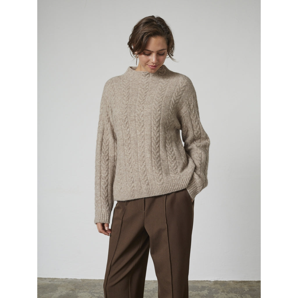 Katey ist ein weicher Zopfstrickpullover mit hohem Kragen und klassischer Form. Die warme Alpaka-Merino-Mischung macht ihn perfekt für kühle Tage – bequem und stilvoll zugleich.