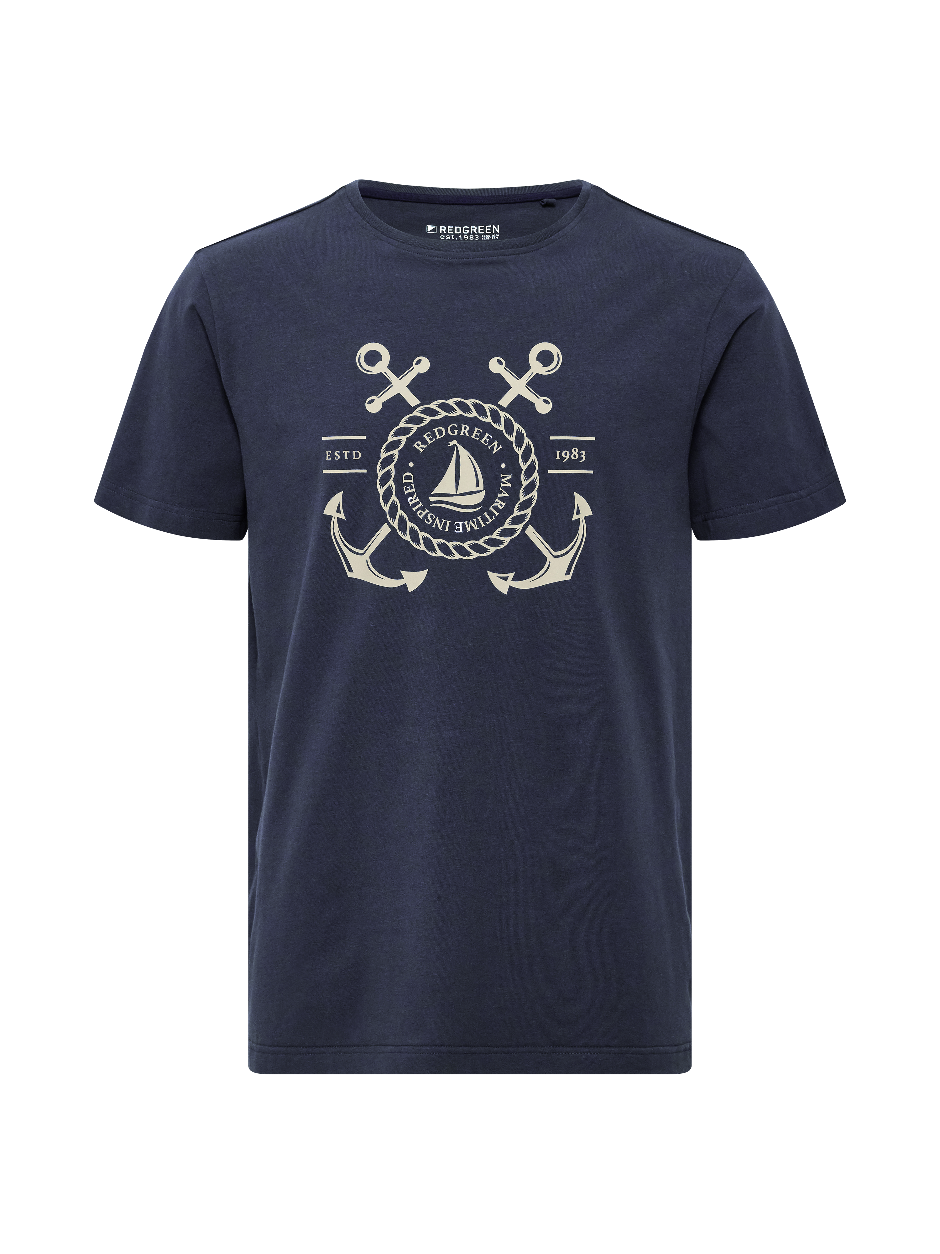 Das Con-T-Shirt hat einen maritimen Aufdruck auf der Brust. Der weiche Baumwollmix mit Stretchanteil sorgt für ganztägigen Tragekomfort und lässt sich problemlos zu Jeans oder Shorts kombinieren.