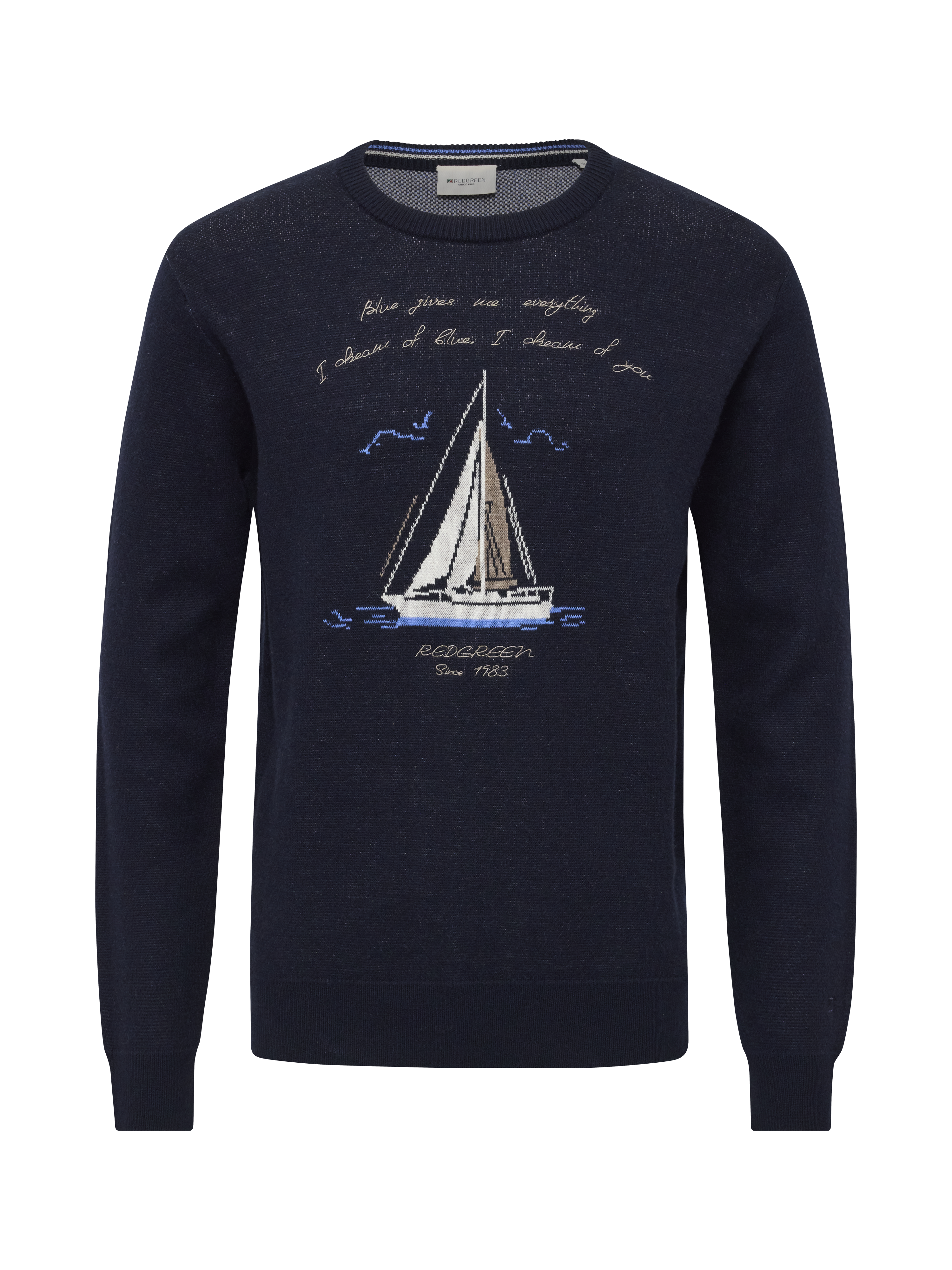 • Jakob ist ein maritim inspirierter Strickpullover mit einem gestickten Segelmotiv auf der Vorderseite. Die weiche Baumwoll-Woll-Mischung sorgt für angenehmen Tragekomfort – perfekt für einen lässigen, aber stilvollen Look.