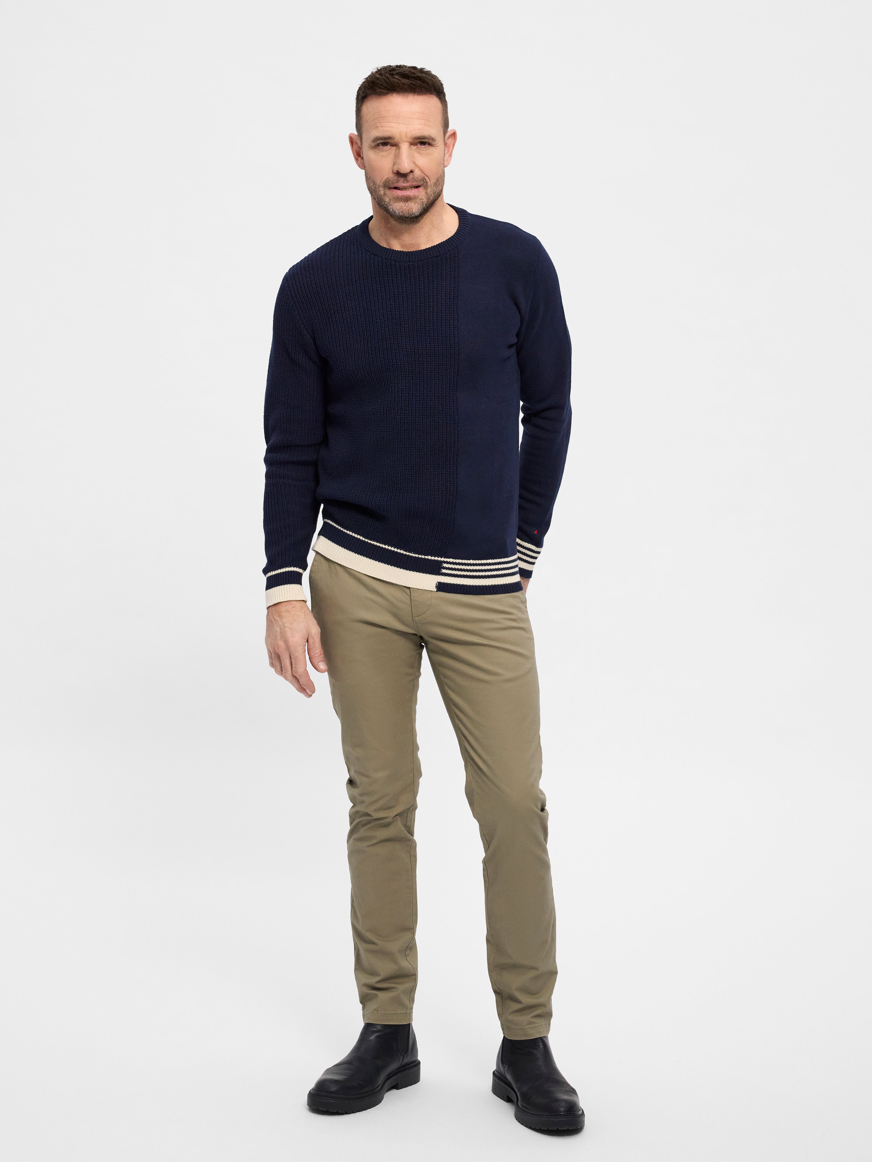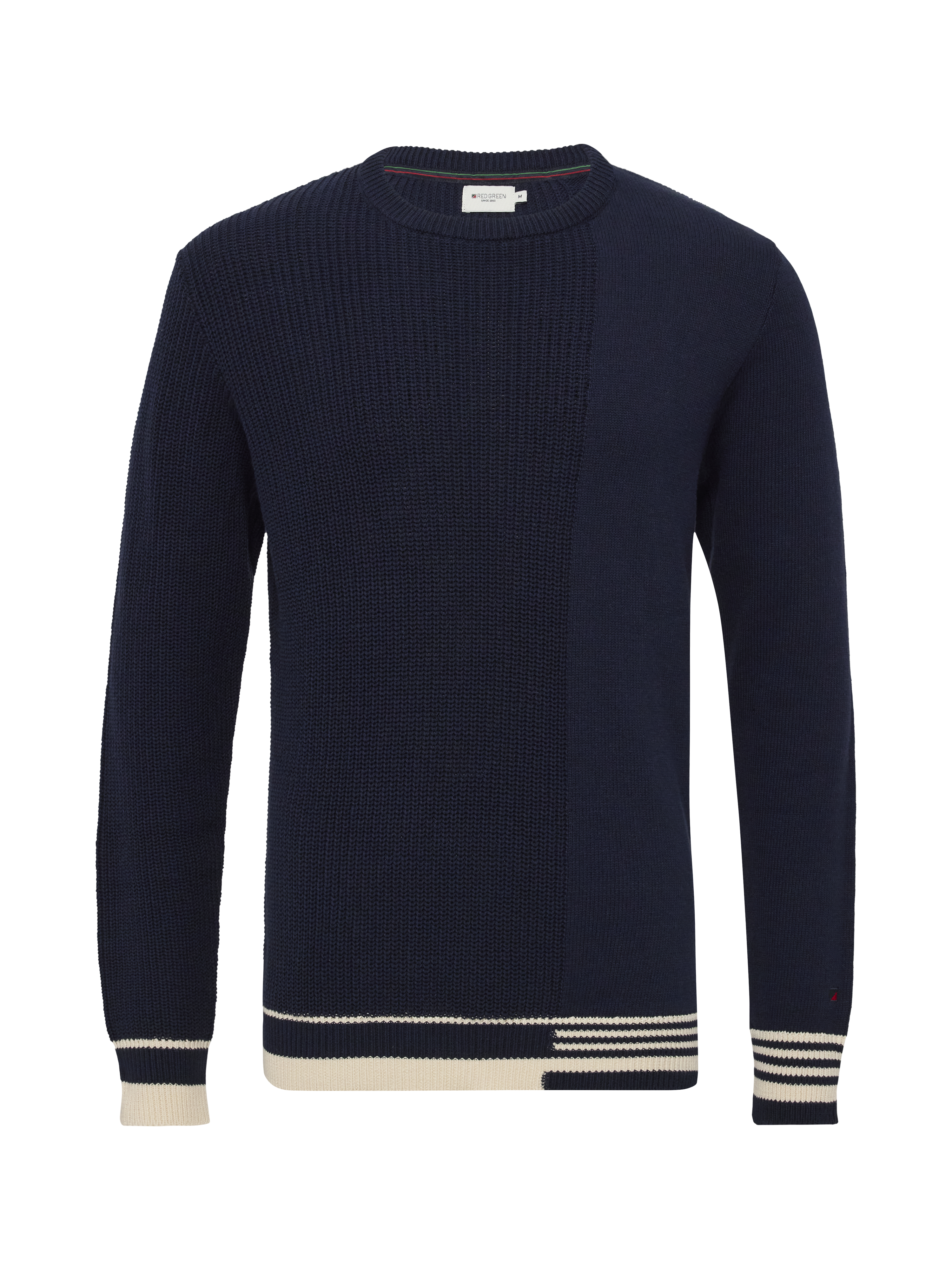 Jaysen ist ein Strickpullover mit strukturiertem Muster und dezenten Kontrastdetails an Bündchen und Saum. Hergestellt aus 100 % Baumwolle – eine stilvolle und bequeme Lösung für jeden Tag.