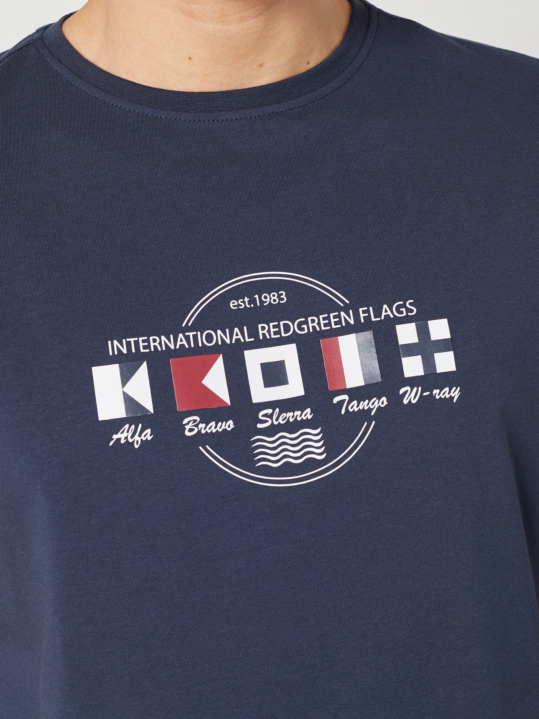 Afslappet herre-T-shirt i blød bomuldsblanding med stræk og et grafisk frontprint med maritim reference. Den komfortable kvalitet og fleksible pasform gør T-shirten velegnet til hverdagsbrug og afslappede fritidslooks.