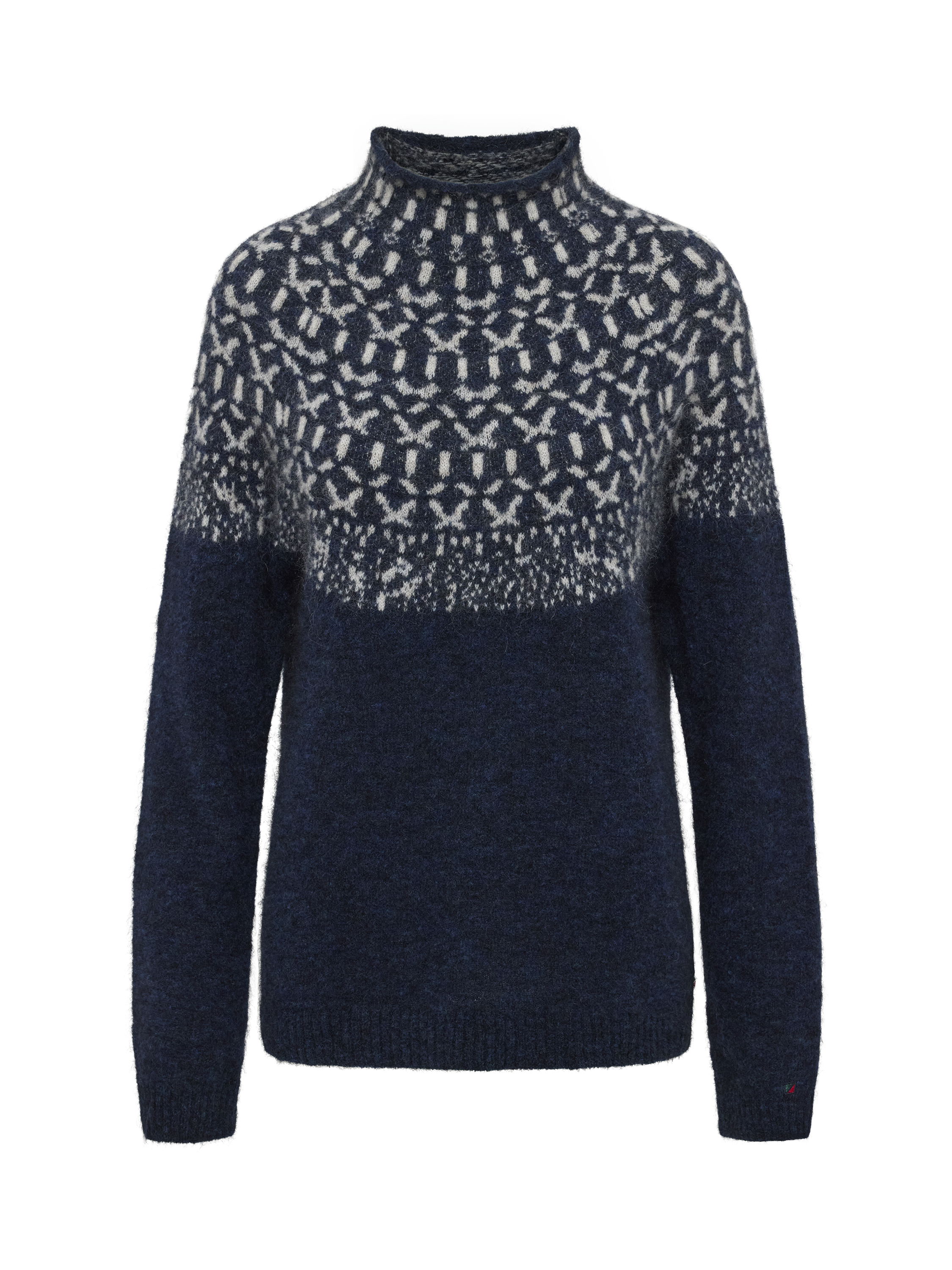 Jesebel Knit har et nordisk mønster og en blød, varm kvalitet. En klassisk strik med høj hals og afslappet pasform – perfekt til kolde dage.
