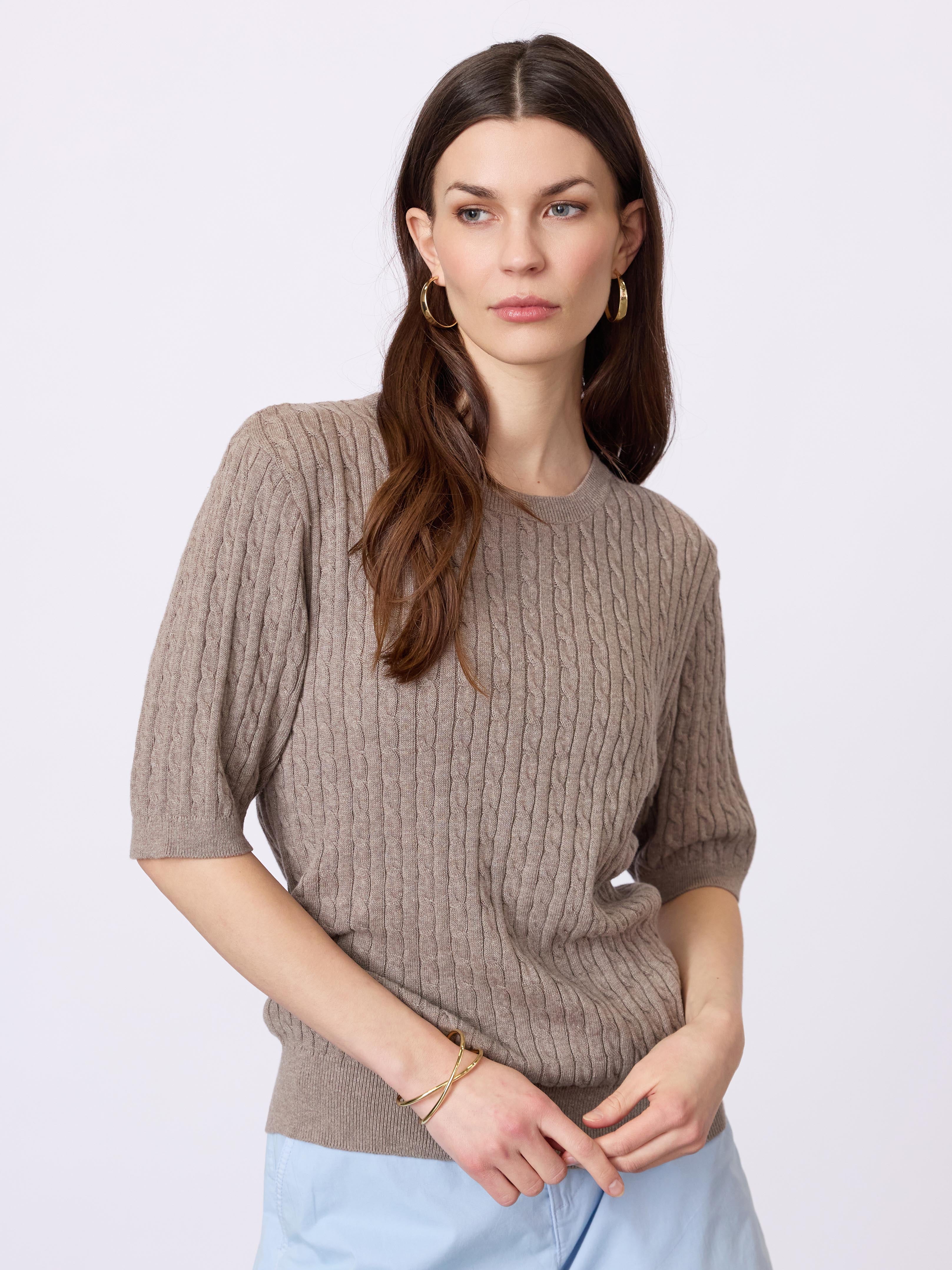 Let og feminin strikbluse i 100% økologisk bomuld med et fint, struktureret mønster og et klassisk udtryk. Blusen har korte ærmer, polokrave og knaplukning foran, som giver et elegant og tidløst look.