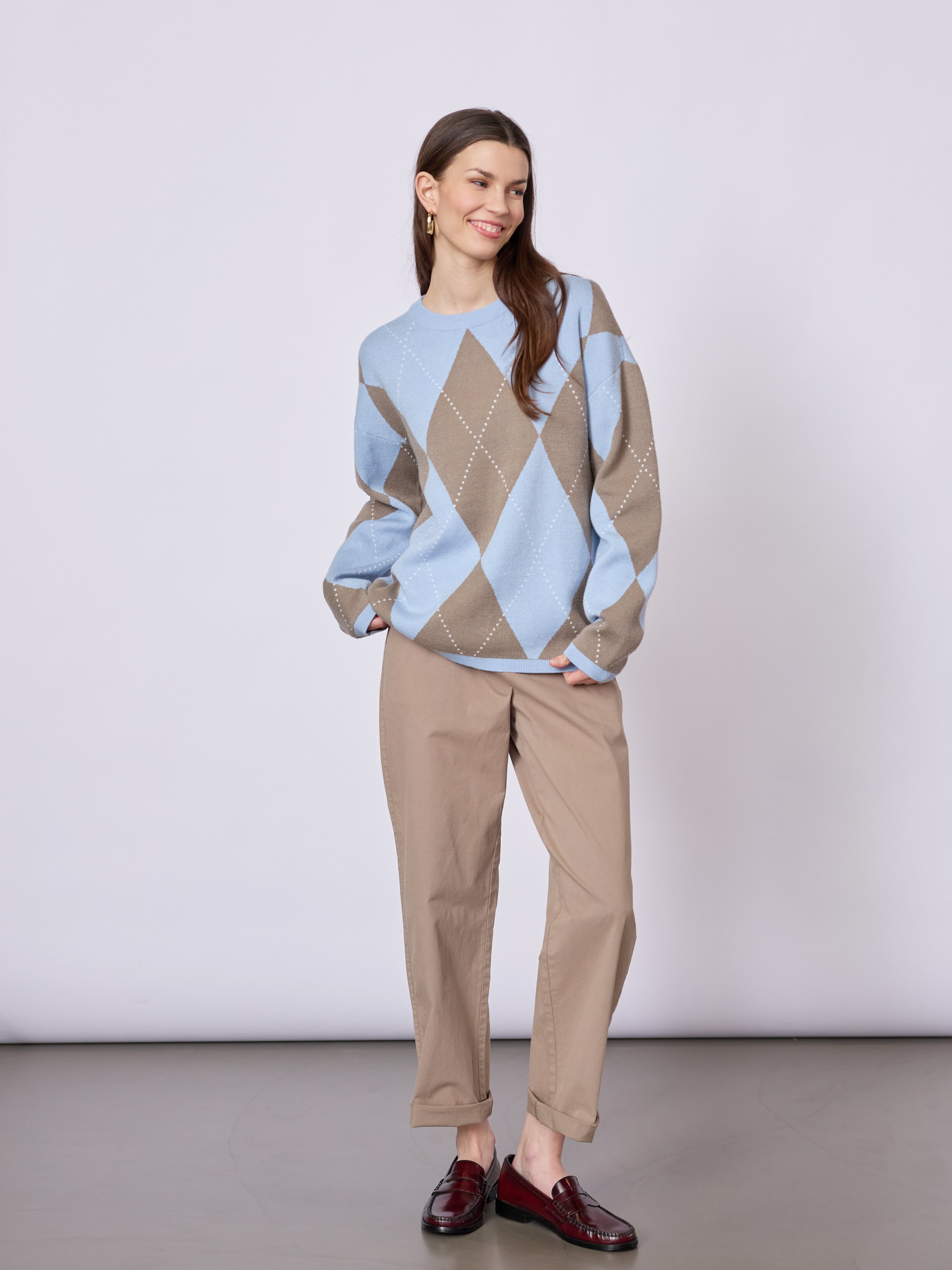 Naja har en tidløs silhuet med et klassisk argyle-mønster og en blød, behagelig kvalitet, der gør den velegnet til både hverdag og afslappede looks. De afdæmpede farver giver et roligt, maritimt udtryk.